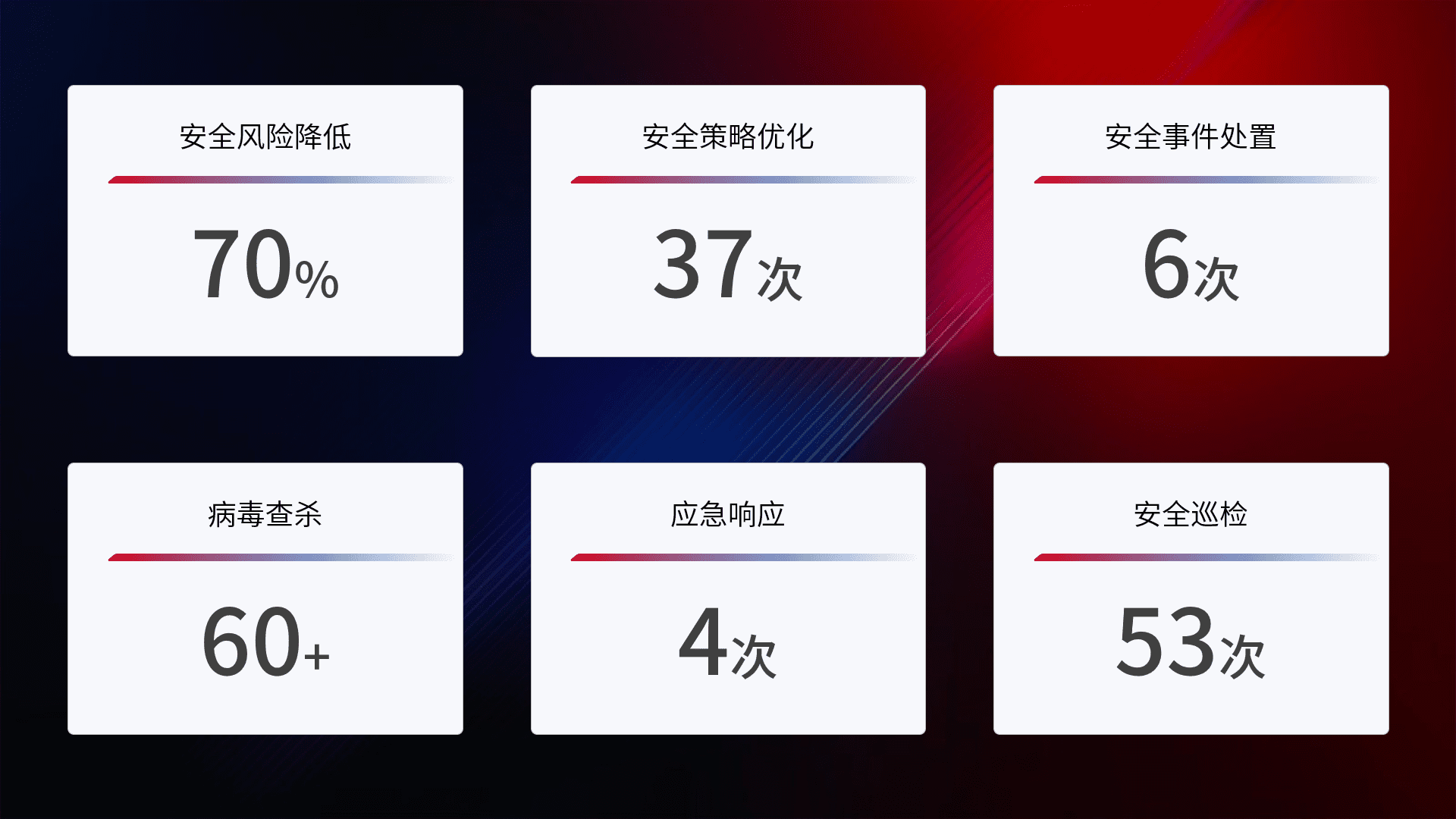 提供全面的安全事件报告体系,,包括处置报告、、周报、、、季度和年度总结,,,,结合持续监控,,帮助客户深入了解网络安全状况。。。